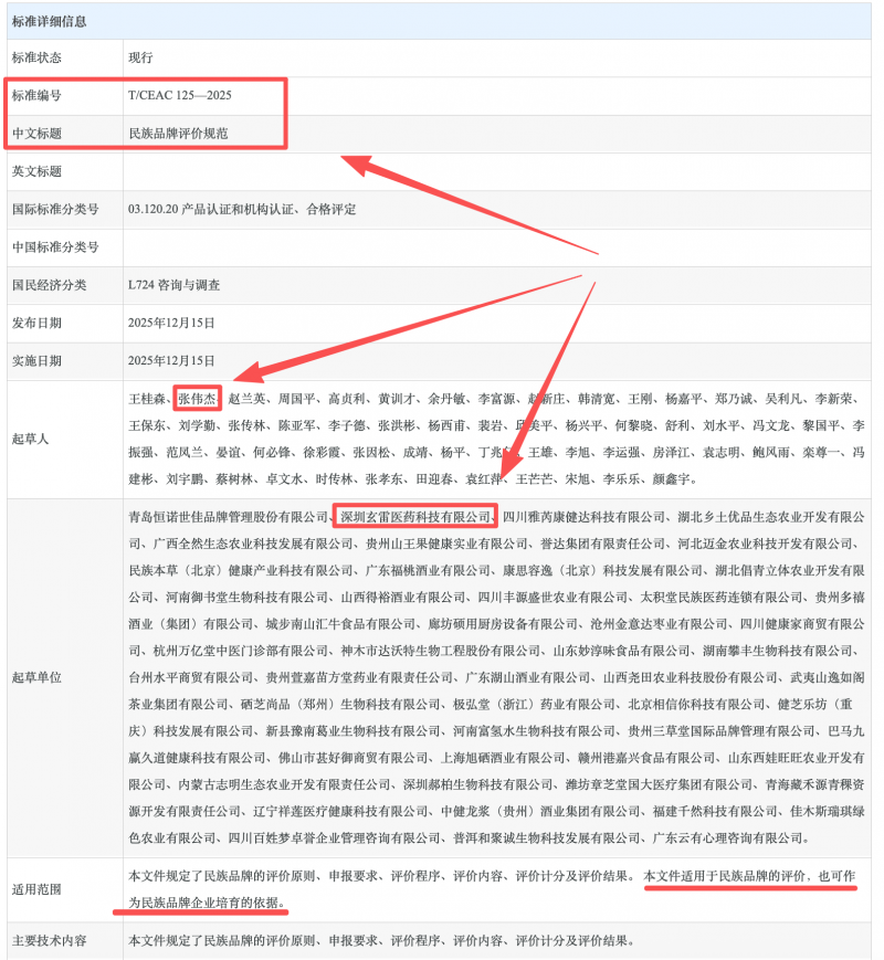 深圳玄雷医药参编《民族品牌评价规范》,团体标准领域再下一城