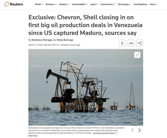 中新网3月11日电(戴悦)在2个月前美国政府对委内瑞拉实施军事打击并强行控制了尼古拉斯·马杜罗总统夫妇后,近日,石油巨头雪佛龙和壳牌公司接近与委内瑞拉达成首批重大石油生产协议。