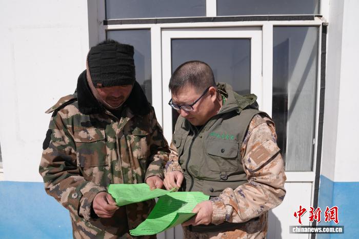 图为韩巴木拉(图右)正在向牧民群众发放保护候鸟的宣传单。金柱 摄
