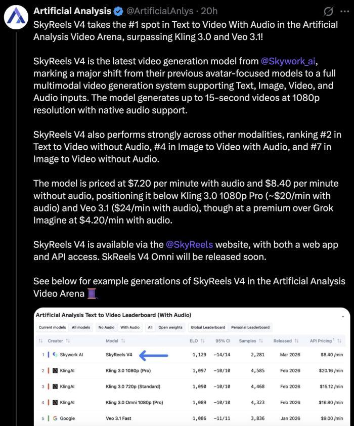 SkyReels V4登上Artificial Analysis榜单全球第一