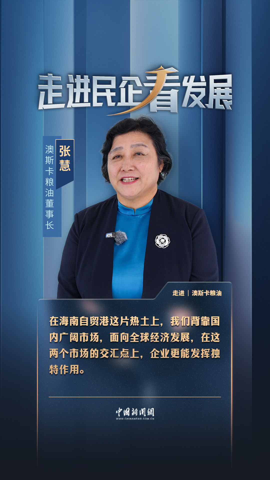 中新网海口11月5日电 (记者 王子谦)“在海南自贸港这片热土上,我们背靠国内广阔市场,面向全球市场发展,在这两个市场的交汇点上,企业更能发挥独特作用。”澳斯卡粮油董事长张慧近日在接受中新网专访时坦言,面对海