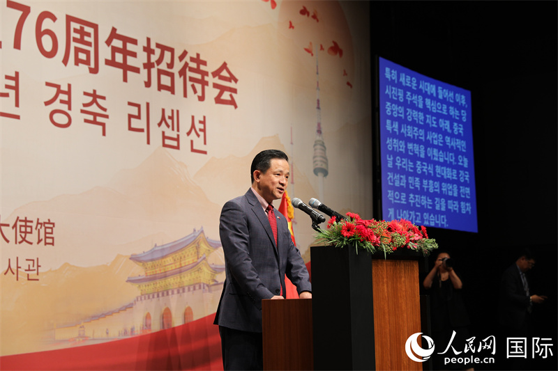 人民网首尔9月26日电(记者莽九晨)25日,中国驻韩国大使馆在首尔隆重举行庆祝中华人民共和国成立76周年招待会。中国驻韩国大使戴兵及使馆主要外交官,韩国国会副议长朱豪英、外交部第一次官朴润柱、韩中议员