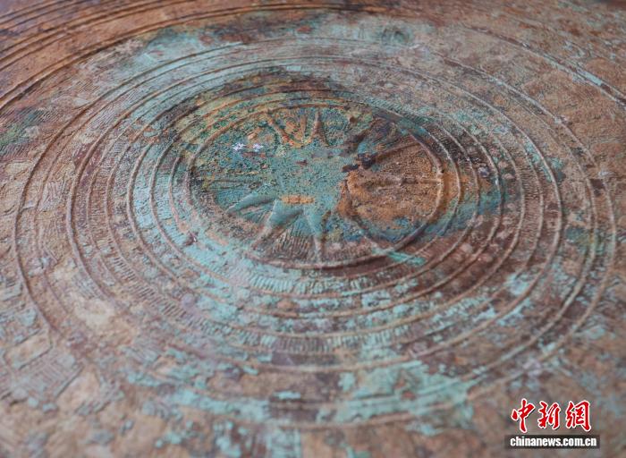 广西柳城疑似出土千年铜鼓图为铜鼓中心的太阳纹。汤晓逵 摄 图为铜鼓上的纹理。汤晓逵 摄 图为鼓边铸着的青蛙。汤晓逵 摄
