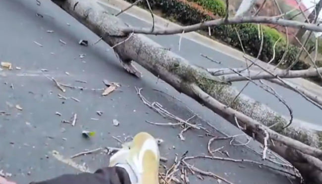 江西一大树突然倒伏横卧马路 骑行者紧急制动摔倒3月18日,江西兴国县将军大道中段绿化带一棵大树突然倒伏横卧马路,一名骑摩托车的市民紧急制动避险时摔翻在地。19日,目击者称倒伏的树木较大,骑车市民自行起身。兴国县城管局回应,系大风将树吹倒,接报后已移走倒伏树木,未接到砸中行人和车辆的报告...