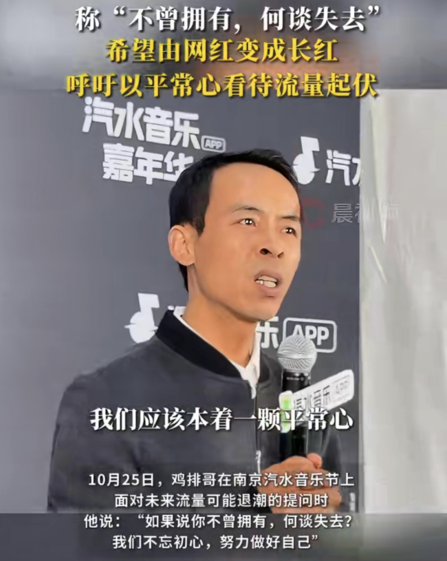鸡排哥回应过气后回归常态 不忘初心做好自己10月25日,“鸡排哥”出现在南京汽水音乐节上。当被问及未来流量可能退潮的问题时,他表示:“如果说你不曾拥有,何谈失去?我们不忘初心,努力做好自己。”他承认自己并非富豪,但将百万粉丝视为无价的精神财富,并呼吁大家以平常心看待流量的起伏