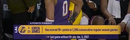 詹姆斯延续得分上双纪录 艰难维持纪录在北京时间的一场NBA常规赛中,洛杉矶湖人队主场以108-125输给了菲尼克斯太阳队,七连胜被终结。湖人球星詹姆斯表现不佳,出场31分14秒,10投3中得到10分、3次助攻,还有3次失误和2次犯规,正负值为-6