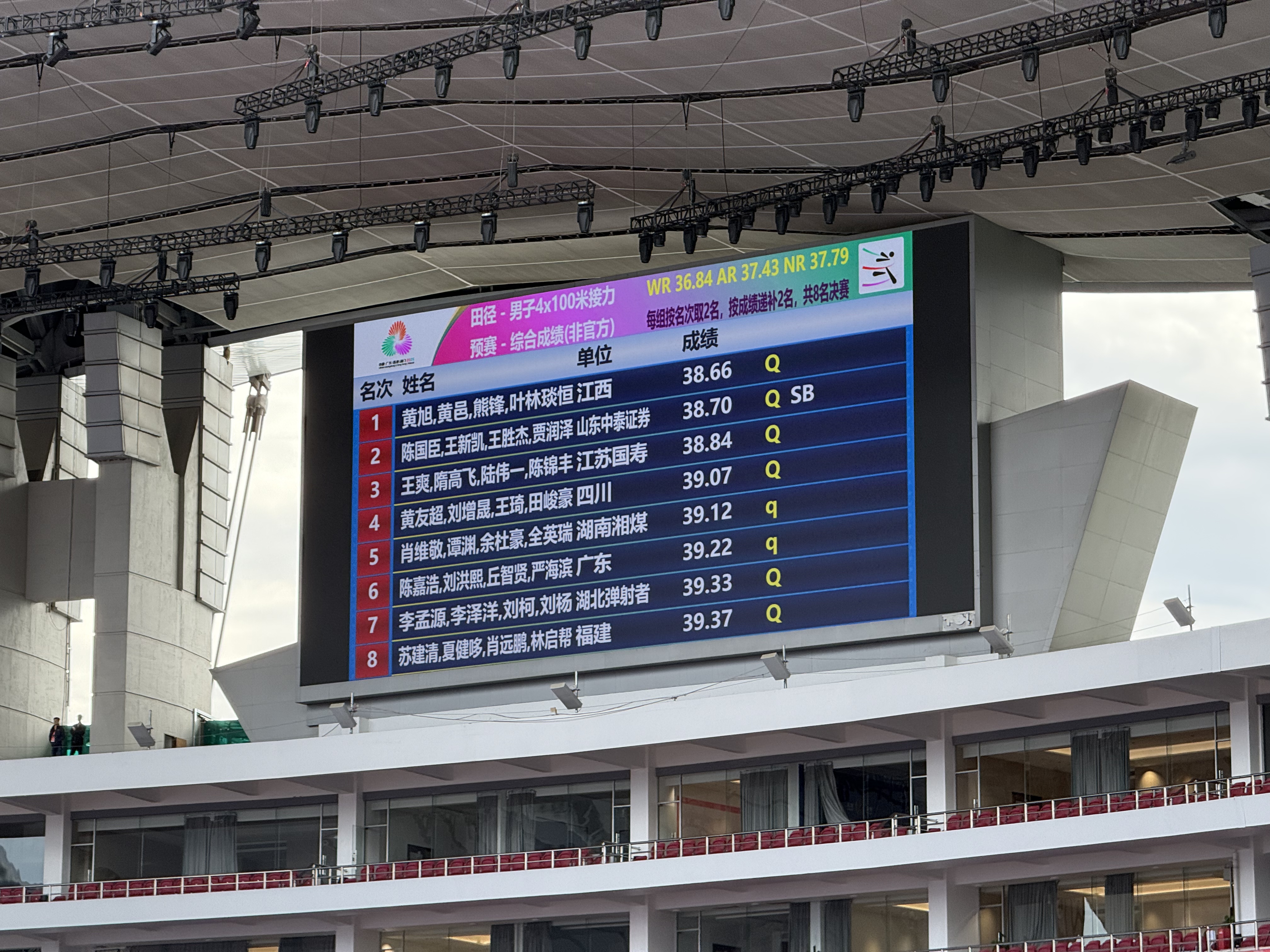 十五运会男子4×100米接力预赛:广东队惊险晋级中新网11月20日电 (记者 蔡敏婕)11月20日,十五运会田径赛场进入最后一天的比拼,备受关注的男子4×100米接力在当天早上进行预赛。江西队以38秒66排名首位。“亚洲飞人”苏炳添并未出战预赛。