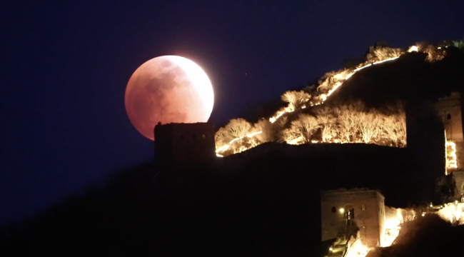 月全食长城同框意境拉满 红月升起震撼美景3月3日,元宵节与月全食相遇。红月亮从长城上升起的景象令人震撼。通过视频可以感受到这一壮观时刻。愿大家平安幸福,岁岁安康
