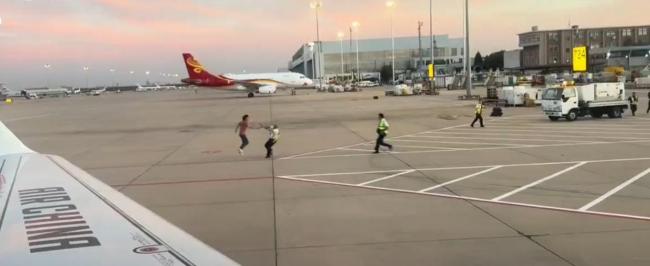 9月22日晚,一位北京网友发布视频称,在乘坐国航CA1107航班时,一名男子在停机坪上疑似闹事被机场警方控制。视频显示,这名男子在停机坪上奔跑,后面有警务人员追赶。尽管警方多次警告,该男子仍绕着飞机跑动,最终被四名民警控制并抬走