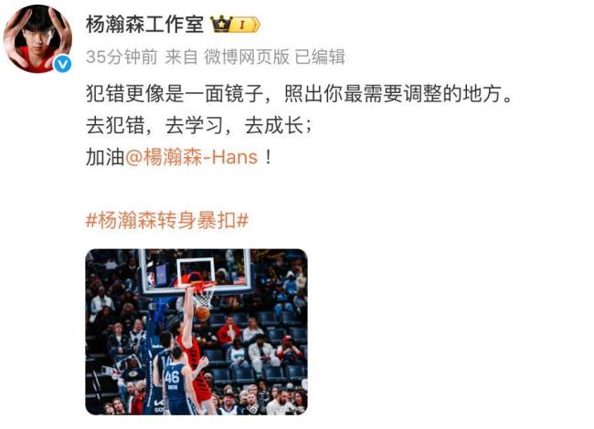 12月8日,NBA常规赛中,开拓者客场对阵灰熊。由于克林根和罗威的缺席,开拓者公布了新的首发阵容,杨瀚森首次首发出战。杨瀚森工作室随后发文表示,犯错像一面镜子,能够反映出需要调整的地方。鼓励杨瀚森去犯错、去学习、去成长,并为他加油