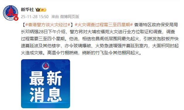 香港警方谈火灾经过 全面调查火灾原因香港特区政府保安局局长邓炳强28日下午介绍了大埔宏福苑火灾的情况。他表示,警方将对火灾进行全面取证和调查,预计调查过程需要三至四个星期。据邓炳强介绍,初步判断火灾起因是宏昌阁低层围网最先起火,随后引燃了发泡胶板并迅速蔓延到其他楼宇