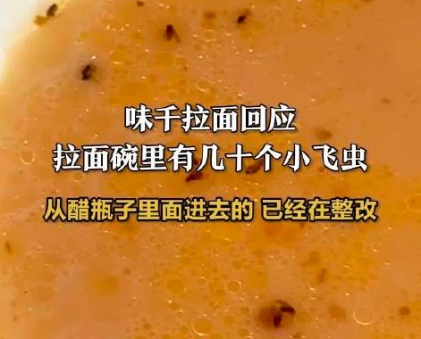 女子味千拉面吃出数十飞虫,店方称醋瓶未冷藏致虫害近日,广东深圳,一女子发视频称自己在味千拉面店里吃拉面,发现碗里有几十个小飞虫。对此,店铺工作人员回应记者称,可能是醋瓶子里的小飞虫,醋的气味比较重,没有及时放冰箱,引来了小飞虫,目前已在整改,会加强管理,还在和顾客协商赔偿的事。...