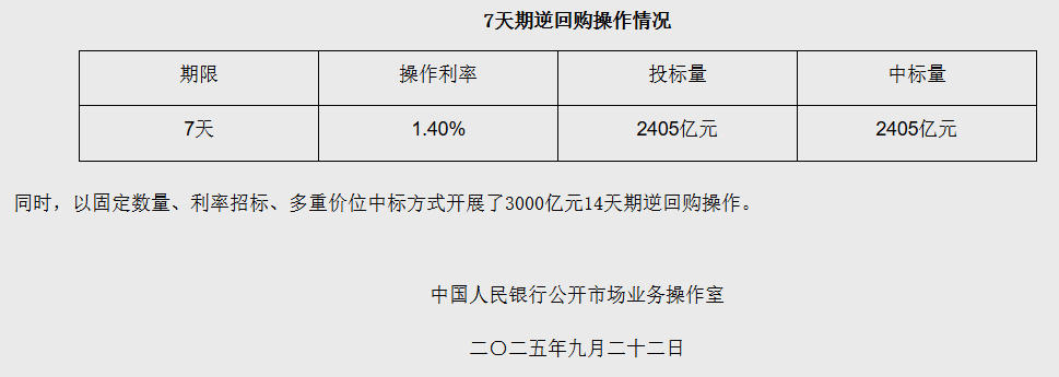 9月22日央行开展2405亿元7天期逆回购操作中新网9月22日电 据央行网站消息,2025年9月22日,中国人民银行以固定利率、数量招标方式开展了2405亿元7天期逆回购操作。