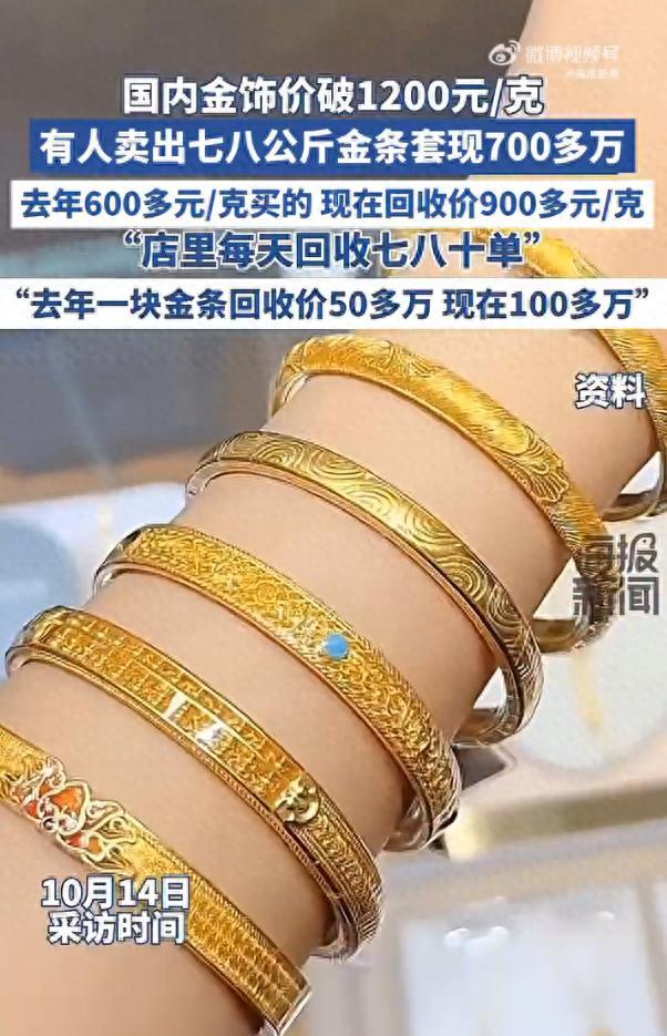 国际金价波动影响了中国国内珠宝品牌的足金首饰价格,10月14日,老庙黄金的足金饰品价格上涨至每克1218元。同一天,厦门一位黄金回收商表示,近期每天能成交几十单,有人甚至将去年购买的金条卖出,套现超过700万元