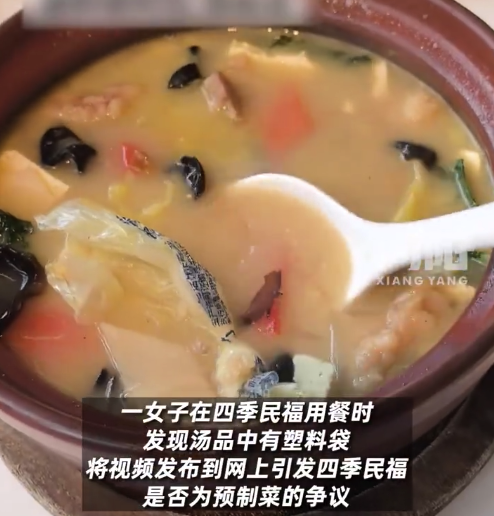 女子在四季民福汤品中吃出塑料袋 四季民福否认9月17日,北京。一女子在四季民福用餐时发现汤品中有塑料袋,将视频发布到网上引发四季民福是否为预制菜的争议。随后,记者致电四季民福了解情况,得知其汤品中的塑料袋是当天封存蔬菜的塑料袋而非预制菜包装,四季民福员工保证称不是预制菜,如果是预制菜...