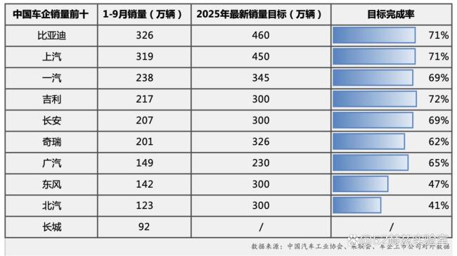 传统车企新能源目标完成率向好 销量表现亮眼前三季度中国车企最新销量数据公布,整体行业表现稳健。根据汽车行业协会的数据,2025年前三季度汽车行业继续保持稳中向好的发展态势。比亚迪和上汽集团位居前列。比亚迪1-9月销量达到326万辆,完成全年460万辆目标的71%