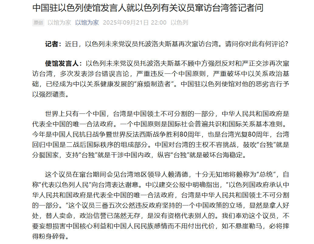 中新网9月22日电 中国驻以色列使馆“以馆为家”微信公众号消息,21日晚,中国驻以色列使馆发言人就以色列有关议员窜访台湾答记者问。