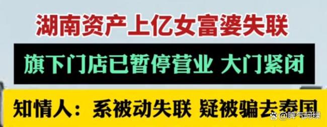 资产上亿女老板失联前称别找自己 背后真相令人震惊亿万女老板神秘失踪,背后真相让人不寒而栗。就在前几天,湖南长沙一位拥有多家连锁美容院的女老板突然失联了。知情人士透露她可能是被骗去了泰国,而且是被动失联